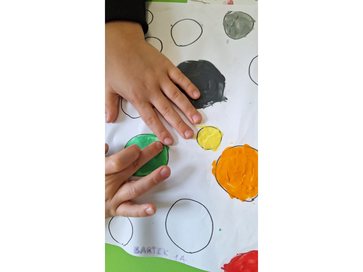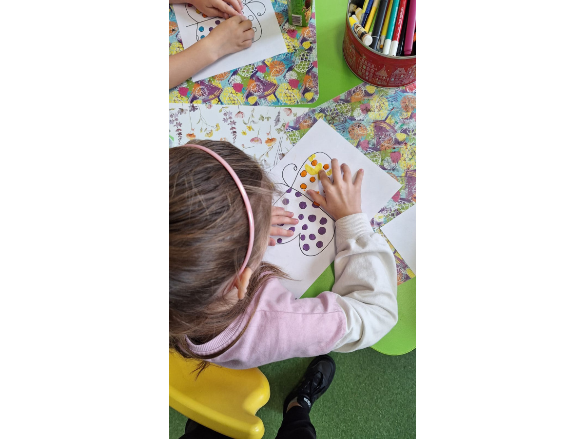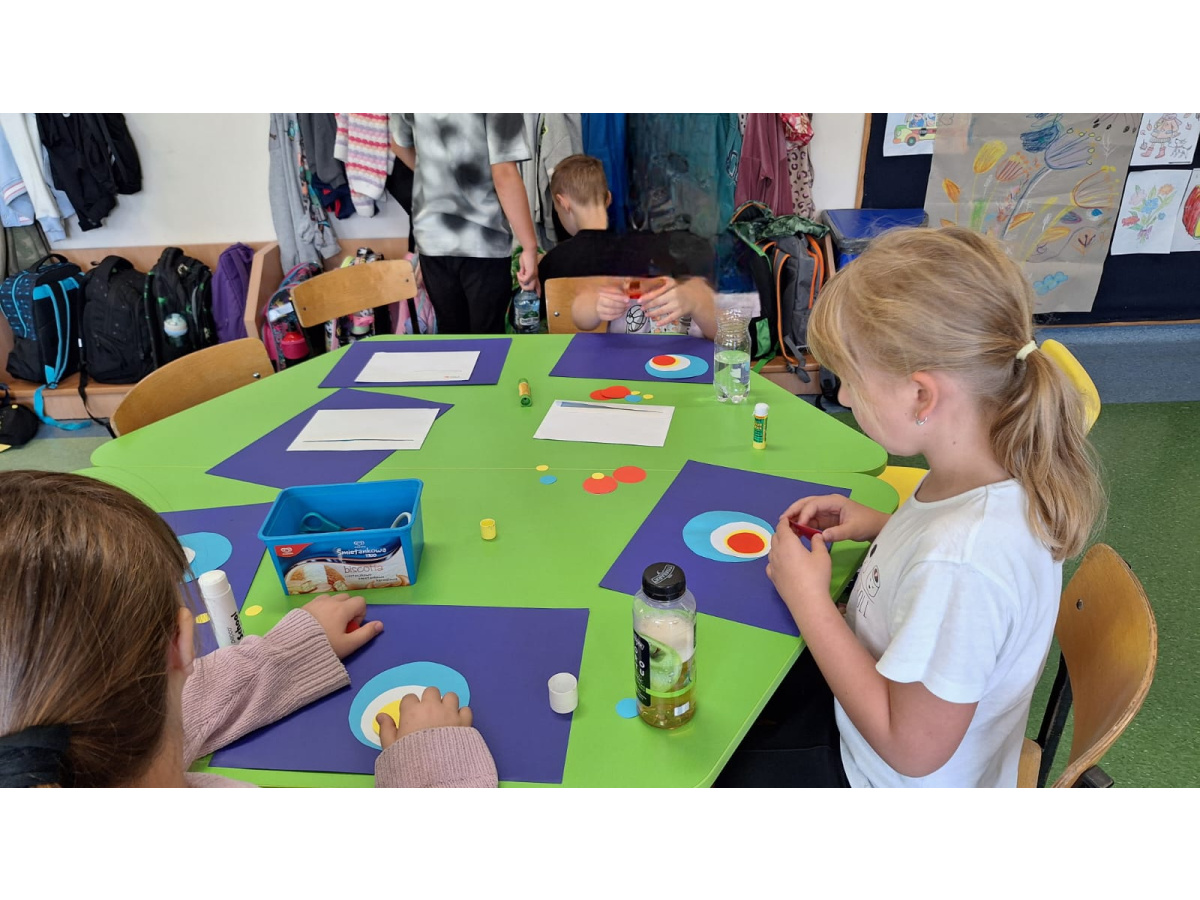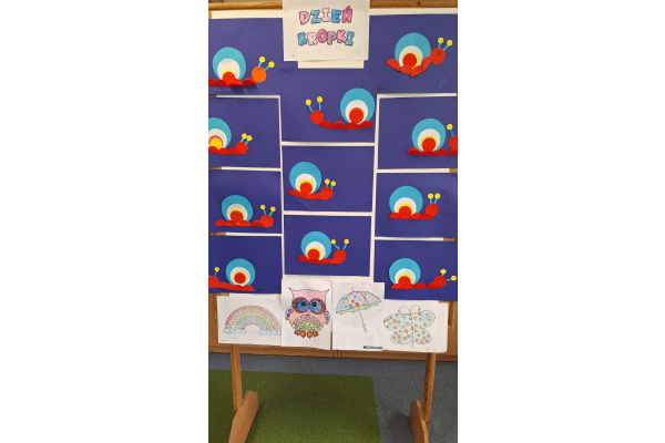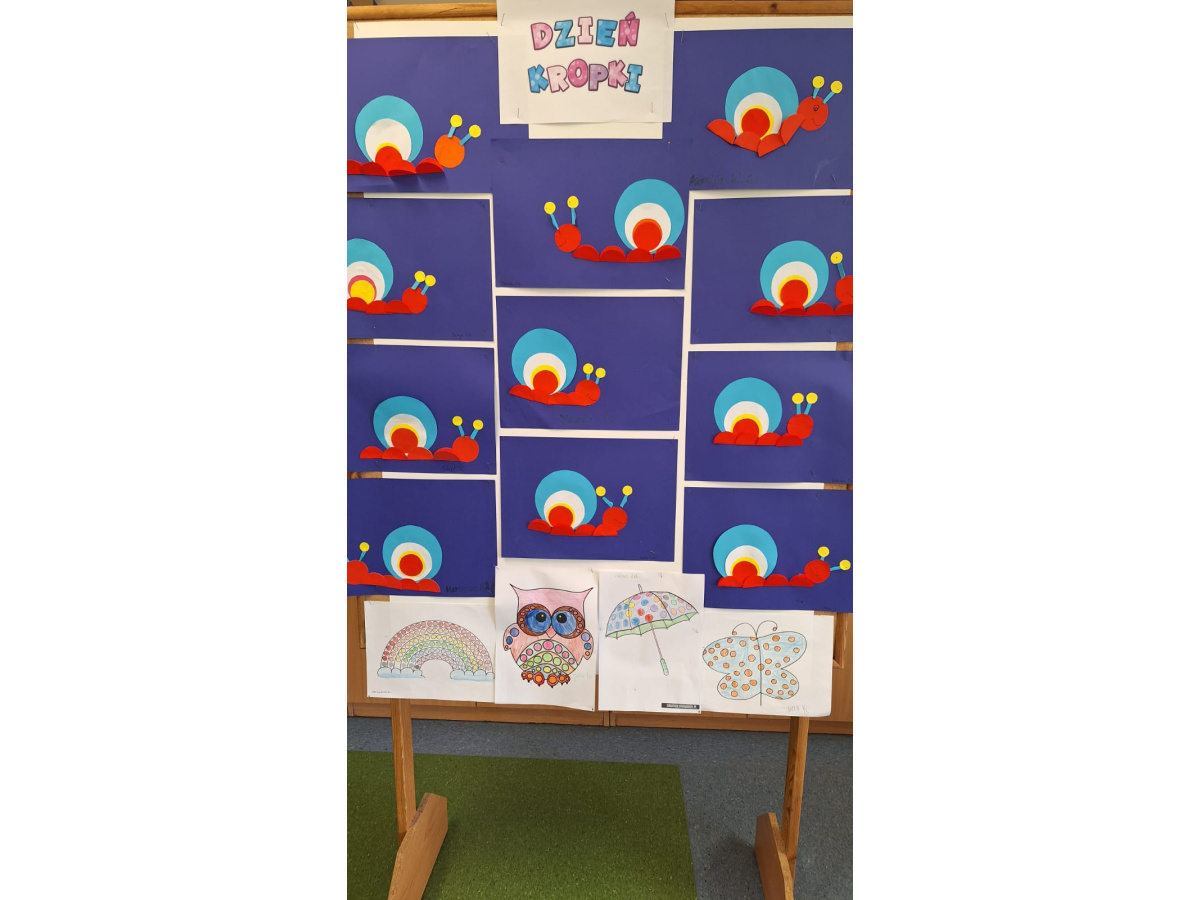 W miesiącu wrześniu świetlica szkolna obchodziła również Dzień Kropki. Z tej okazji dzieci wysłuchały opowiadania H.Reynoldsa pt. ,,Kropka'', wzięły udział w zajęciach origami płaskie z koła, wyklejając kolorowe ślimaki. Urozmaiceniem zajęć były wyklejanki wzorów z plasteliny.