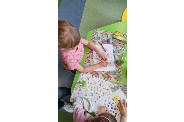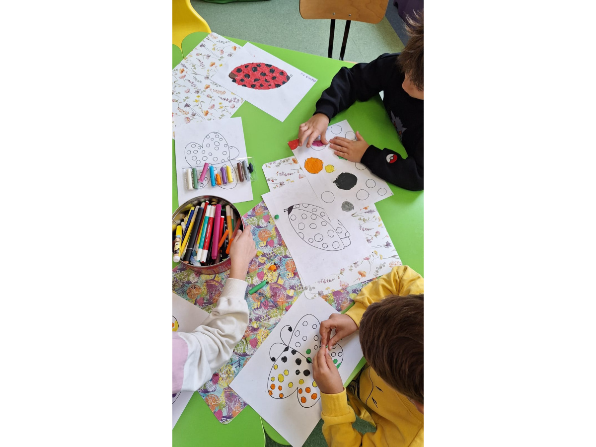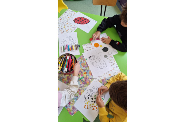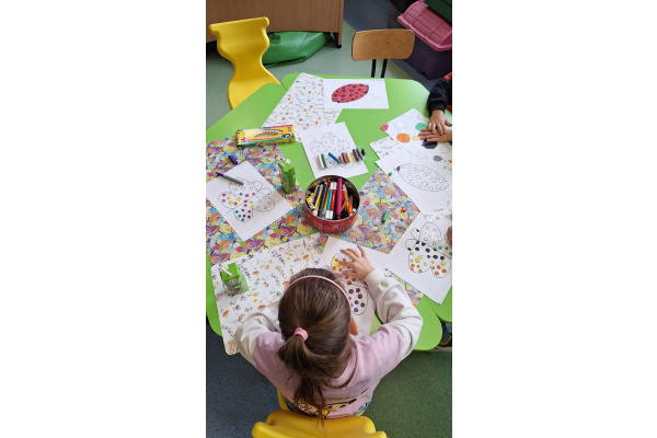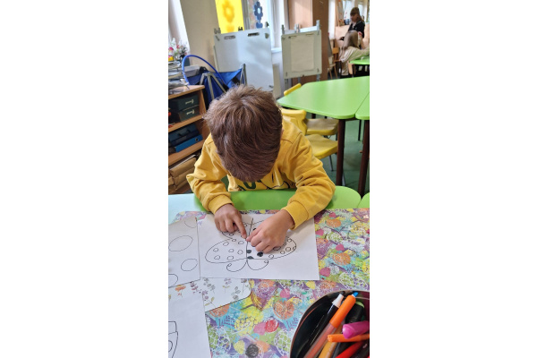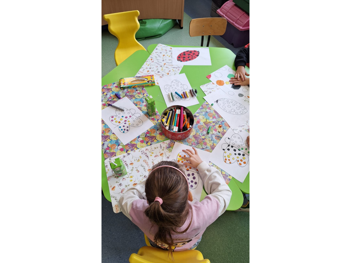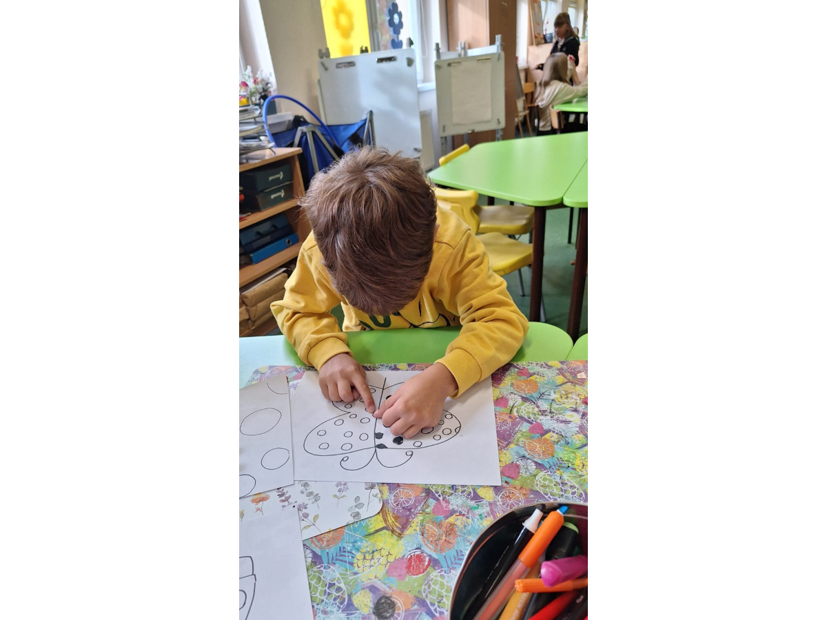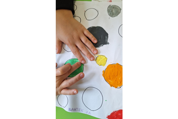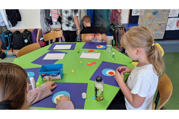 W miesiącu wrześniu świetlica szkolna obchodziła również Dzień Kropki. Z tej okazji dzieci wysłuchały opowiadania H.Reynoldsa pt. ,,Kropka'', wzięły udział w zajęciach origami płaskie z koła, wyklejając kolorowe ślimaki. Urozmaiceniem zajęć były wyklejanki wzorów z plasteliny.