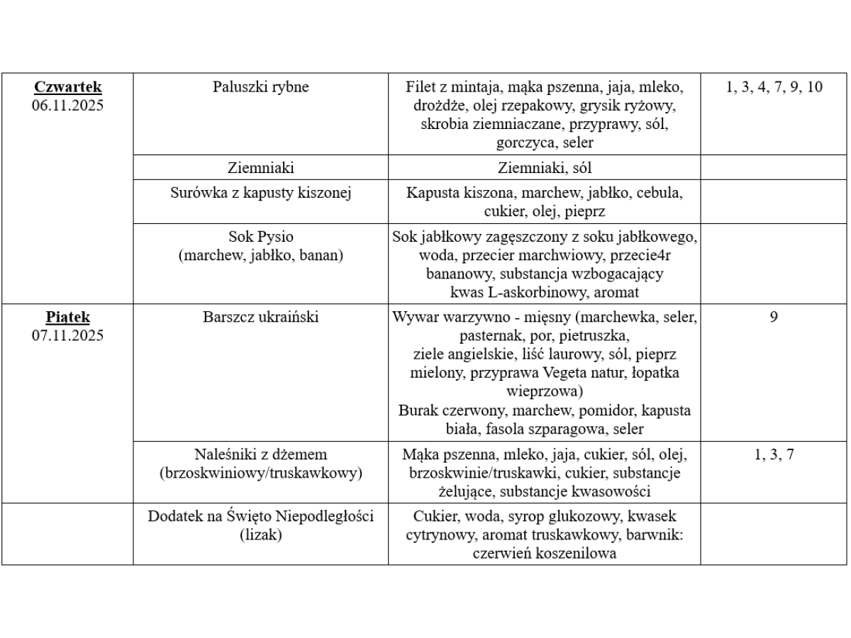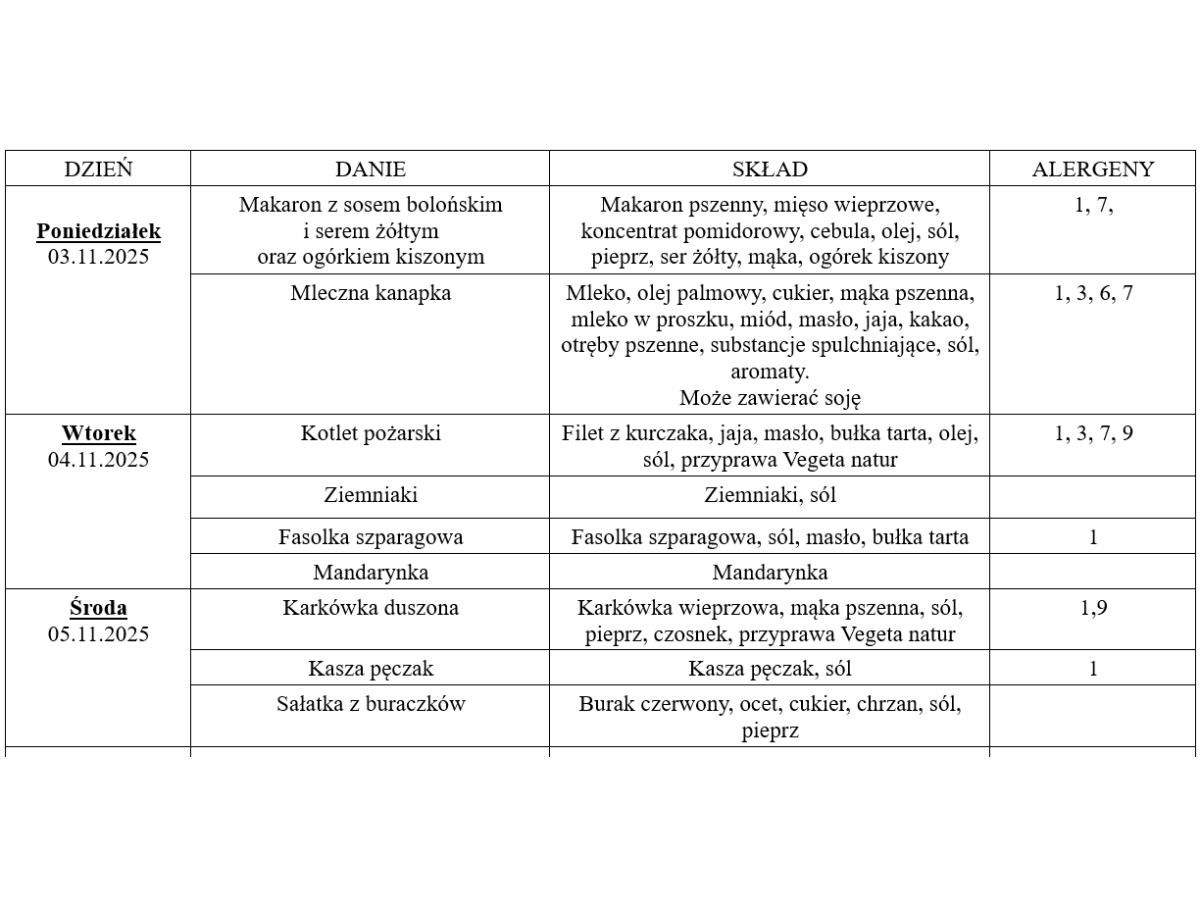 Jadłospis od 03.11.2025 do 07.11.2025