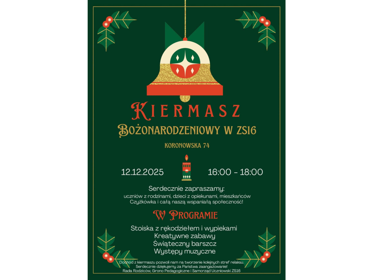 Serdecznie zapraszamy wszystkich mieszkańców Czyżkówka na Kiermasz Bożonarodzeniowy do Zespołu szkół nr 16!