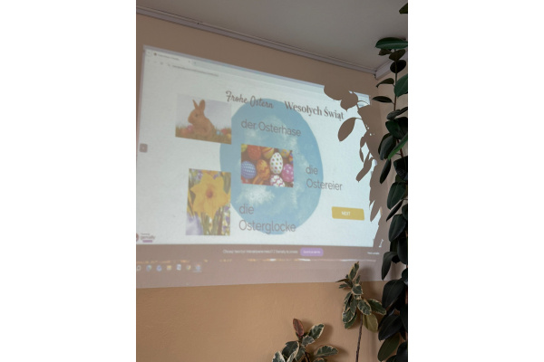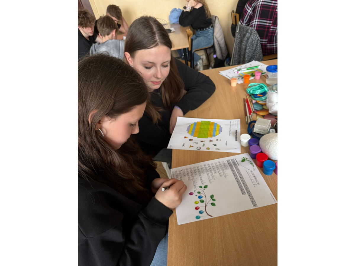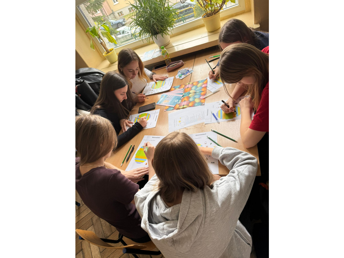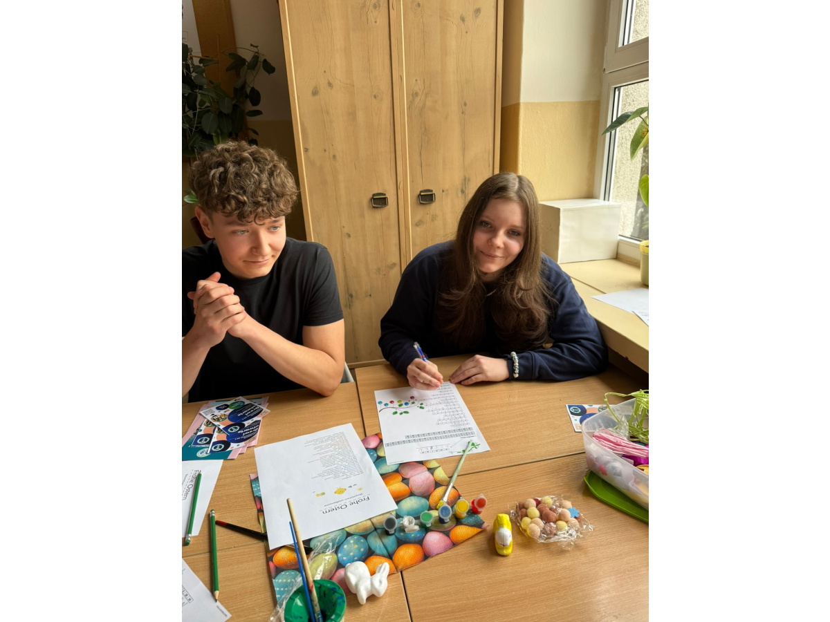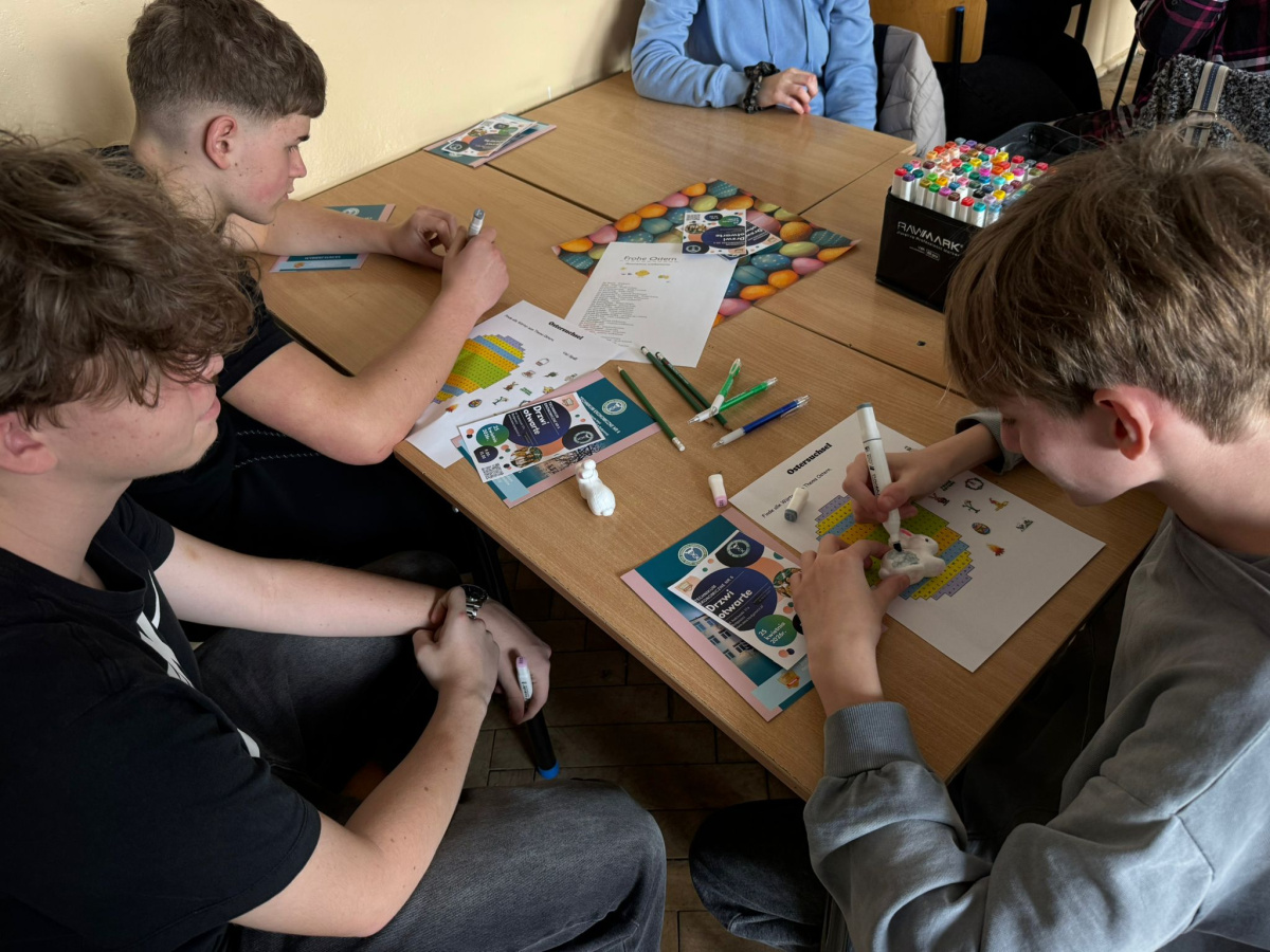 Na dzisiejszych lekcjach języka niemieckiego w naszej szkole odbyły się wyjątkowe warsztaty wielkanocne pod hasłem „Frohe Ostern”. Uczniowie klas 7 wspólnie z koleżankami i kolegami z Zespołu Szkół Ekonomiczno-Administracyjnych w Bydgoszczy, mieli okazję sprawdzić swoje umiejętności językowe w praktyce, biorąc udział w różnorodnych zadaniach o tematyce świątecznej.