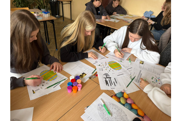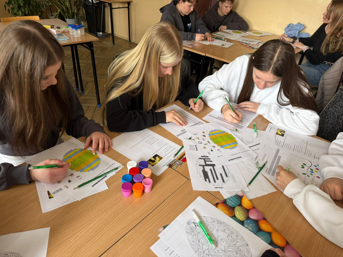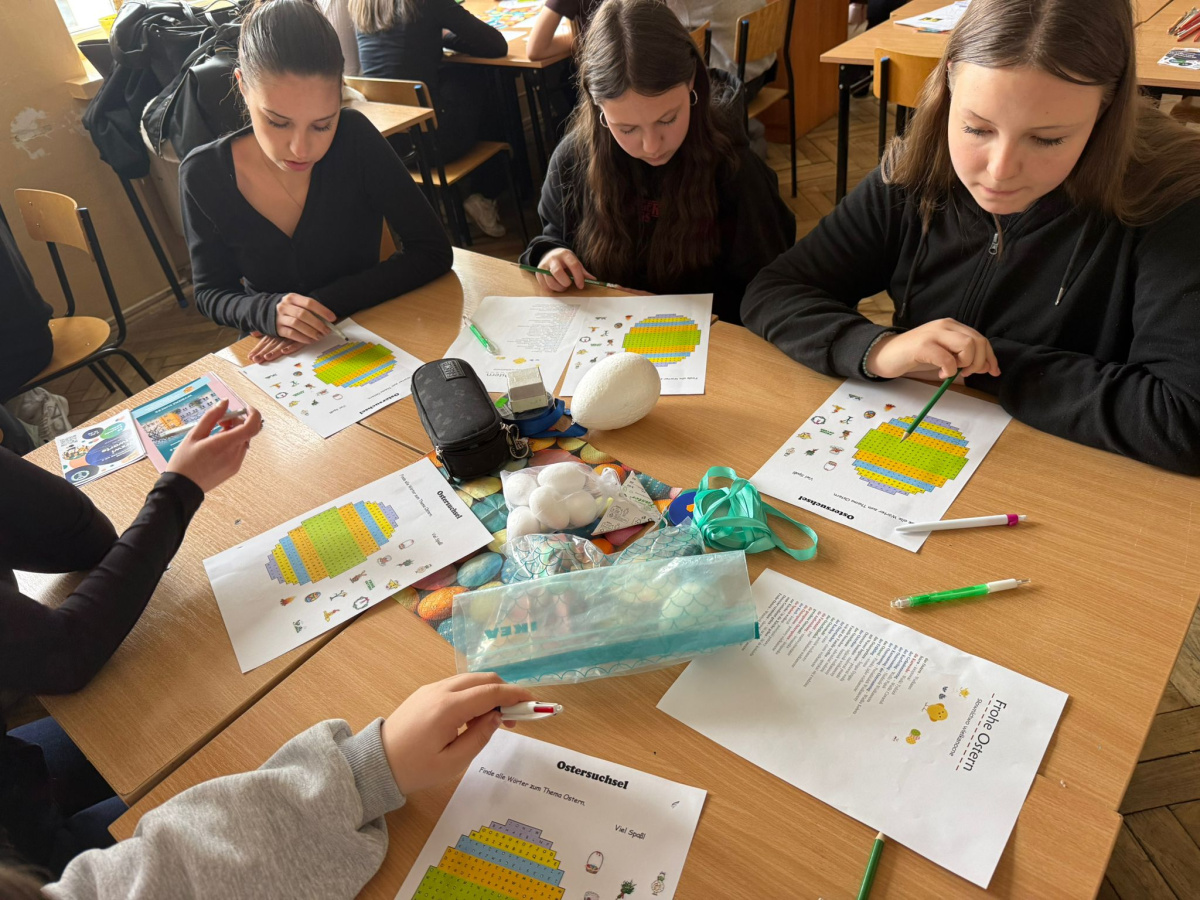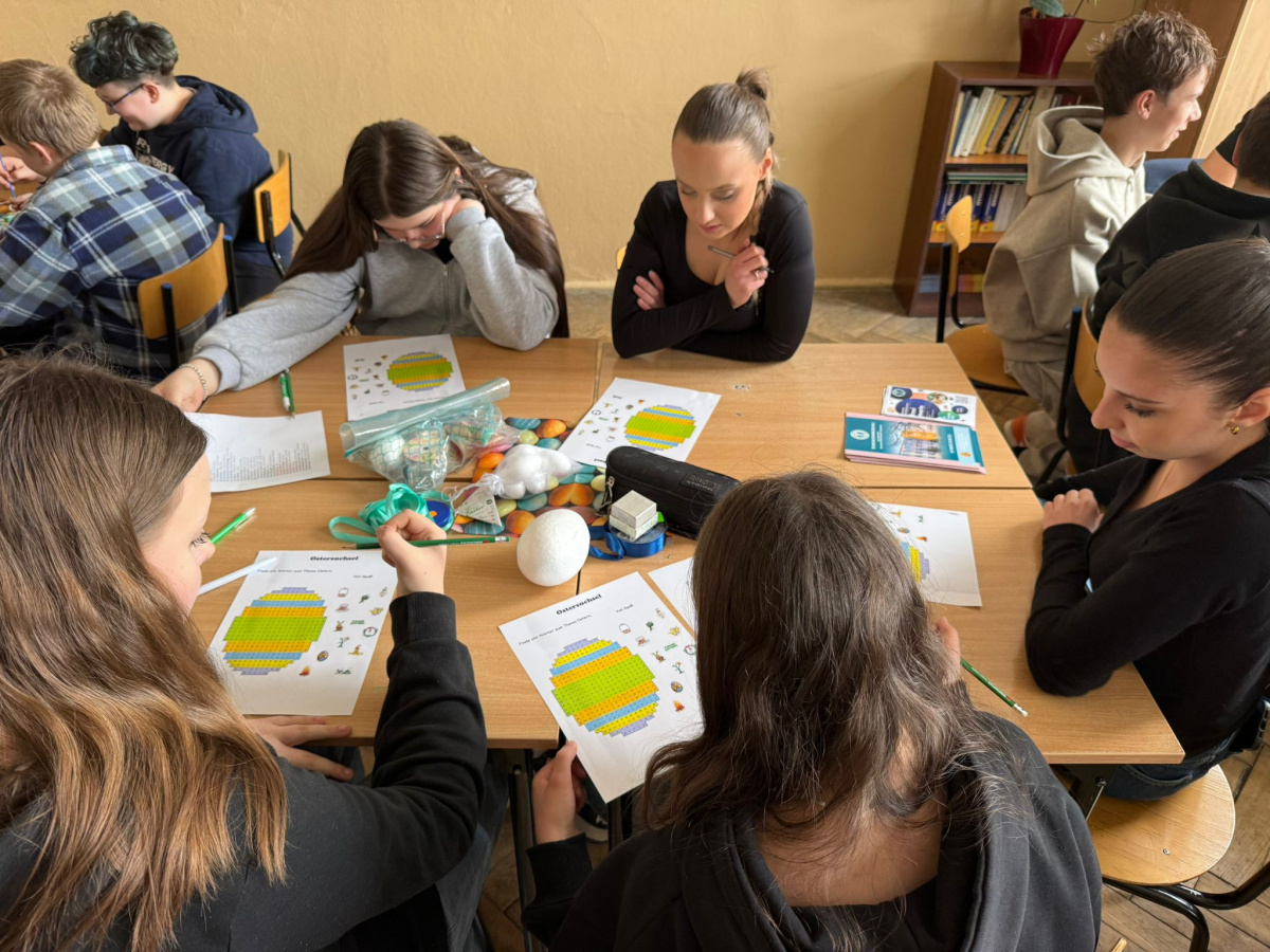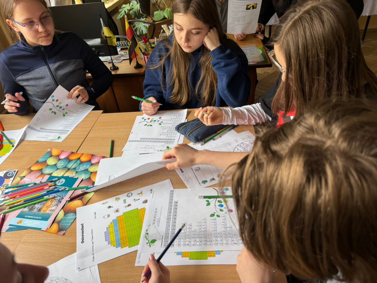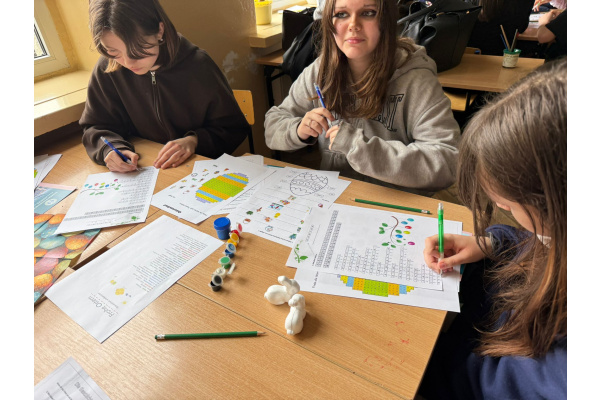 Na dzisiejszych lekcjach języka niemieckiego w naszej szkole odbyły się wyjątkowe warsztaty wielkanocne pod hasłem „Frohe Ostern”. Uczniowie klas 7 wspólnie z koleżankami i kolegami z Zespołu Szkół Ekonomiczno-Administracyjnych w Bydgoszczy, mieli okazję sprawdzić swoje umiejętności językowe w praktyce, biorąc udział w różnorodnych zadaniach o tematyce świątecznej.
